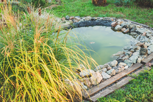 Beautiful View Of Round Decorative Outdoor Fish Pond On Green